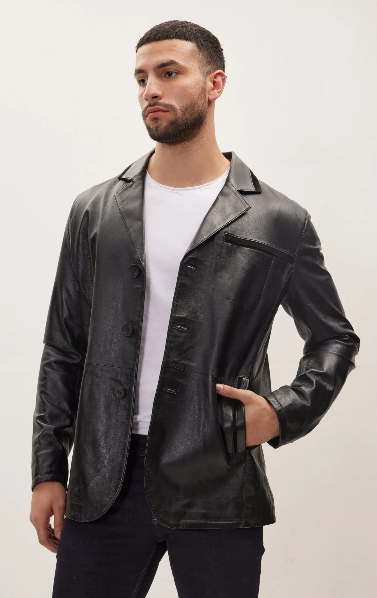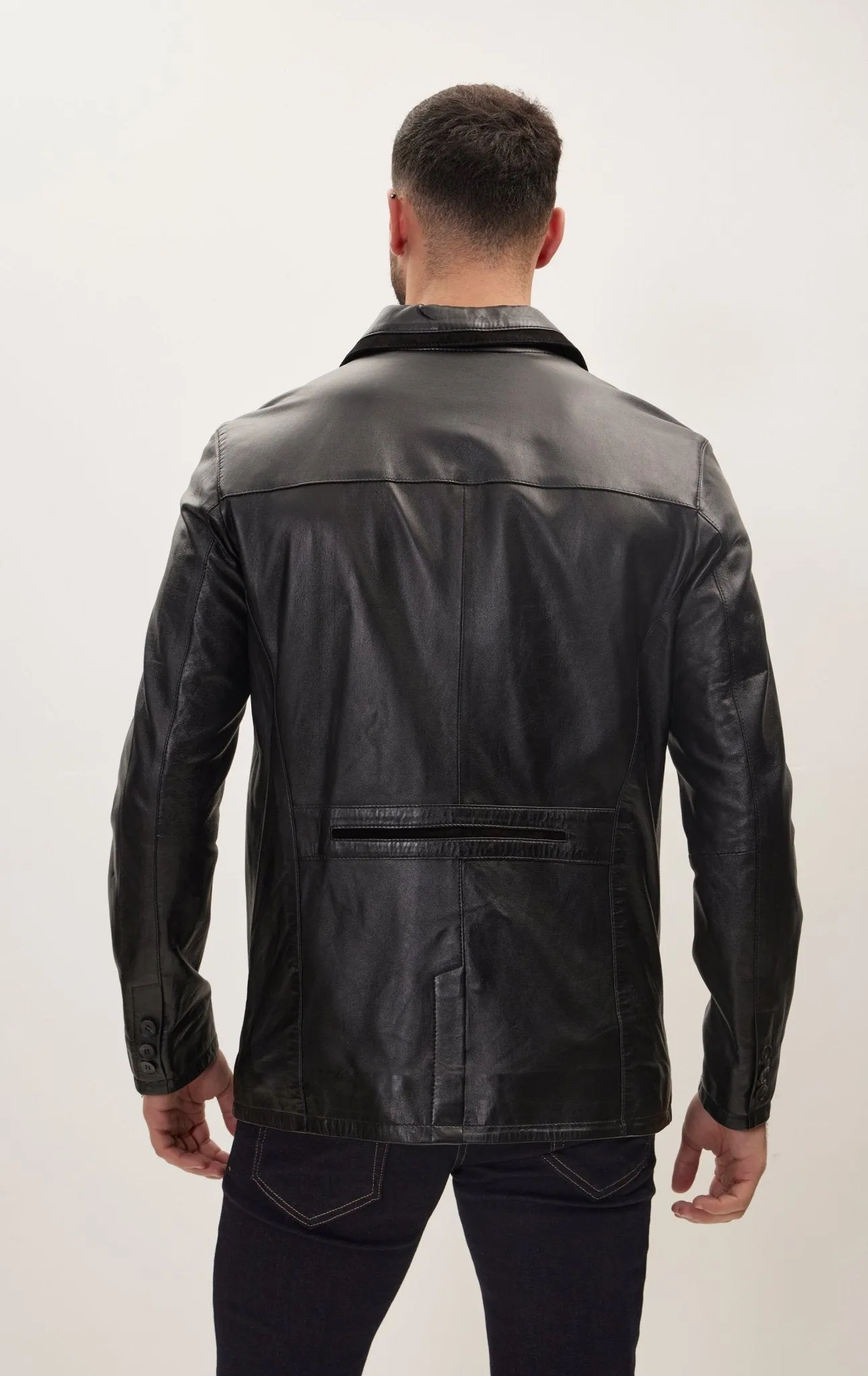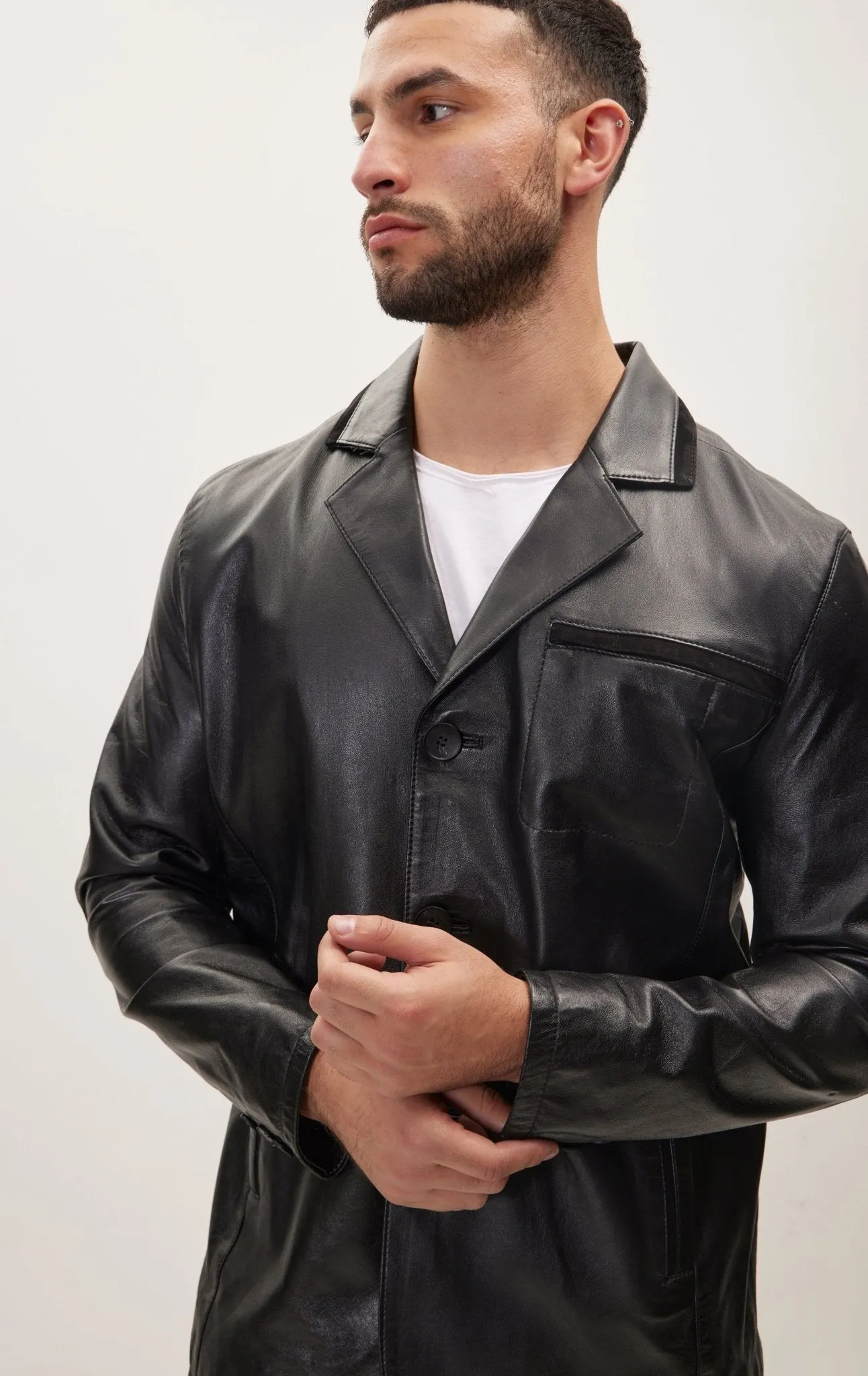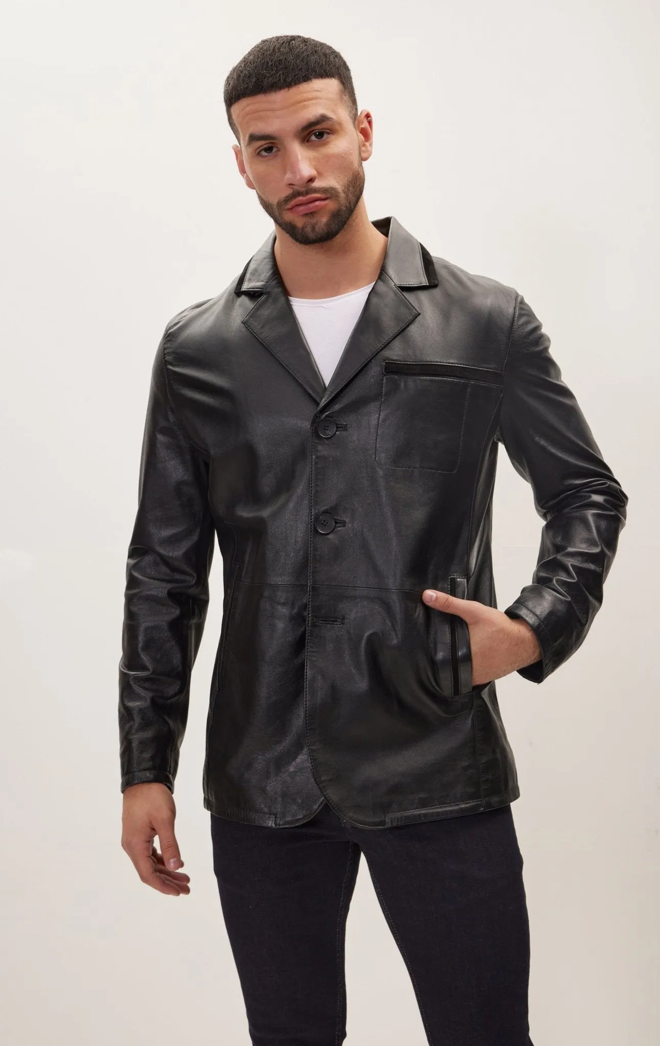 Introducing the Ron Tomson Classic 3-Button Leather Blazer, the epitome of timeless style and contemporary refinement. Expertly crafted for a slim fit with a double-vented design, this blazer accentuates your silhouette while ensuring comfort and ease of movement. The inclusion of suede details on the trims and side pockets adds a touch of luxury and sophistication, elevating the blazer to new heights of elegance. With its three-button closure, this blazer seamlessly combines traditional charm with modern tailoring, making it a versatile and distinguished addition to your wardrobe.